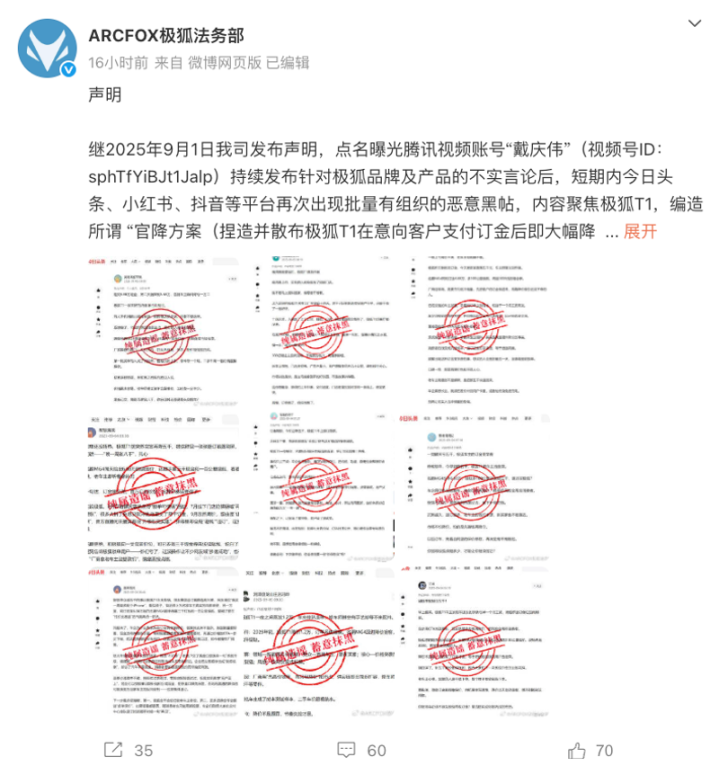 易车讯日前,极狐法务部在微博上发布官方声明,继2025年9月1日我司发布声明,点名曝光腾讯视频账号“戴庆伟”(视频号ID:sphTfYiBJt1Jalp)持续发布针对极狐品牌及产品的不实言论后,短期内今日头条、小红书、抖音等平台再次出现批量有组织的恶意黑帖,内容聚焦极狐T1,编造所谓“官降方案(捏造并散布极狐T1在意向客户支付订金后即大幅降价的谣言)”、“故障解析报告”、“拖延上市”等虚假信息,雷同内容每日近百条,已严重误导市场判断,对我司商誉和极狐汽车声誉造成伤害。