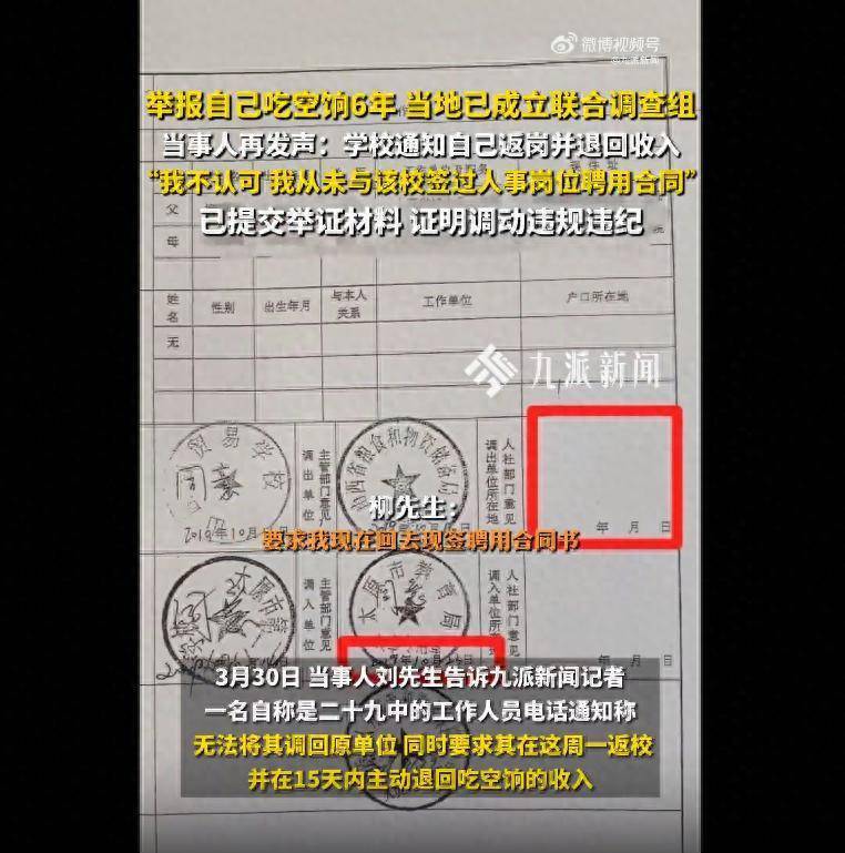 近日,山西的柳先生举报自己吃空饷:他于2019年12月从山西省贸易学校被调入太原市第二十九中学,但并没有开始新工作。他表示,自己6年来没上过班,却一直被动领工资。3月30日,当事人刘先生告诉九派新闻记者,一名自称是二十九中的工作人员电话通知称,无法将其调回原单位,同时要求其在这周一返校,并在15天内主动退回吃空饷的收入。